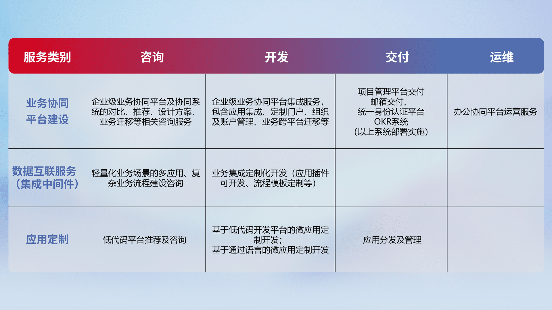 针对钉钉、、企微、、、IDaas等平台级产品提供产品的规划、、、、方案、、、、交付、、定制化开发等服务,,实现如统一协同办公、、智能客户服务、、、混合会议管理、、、智能数据查询、、等业务场景,,,实现数字化转型。。