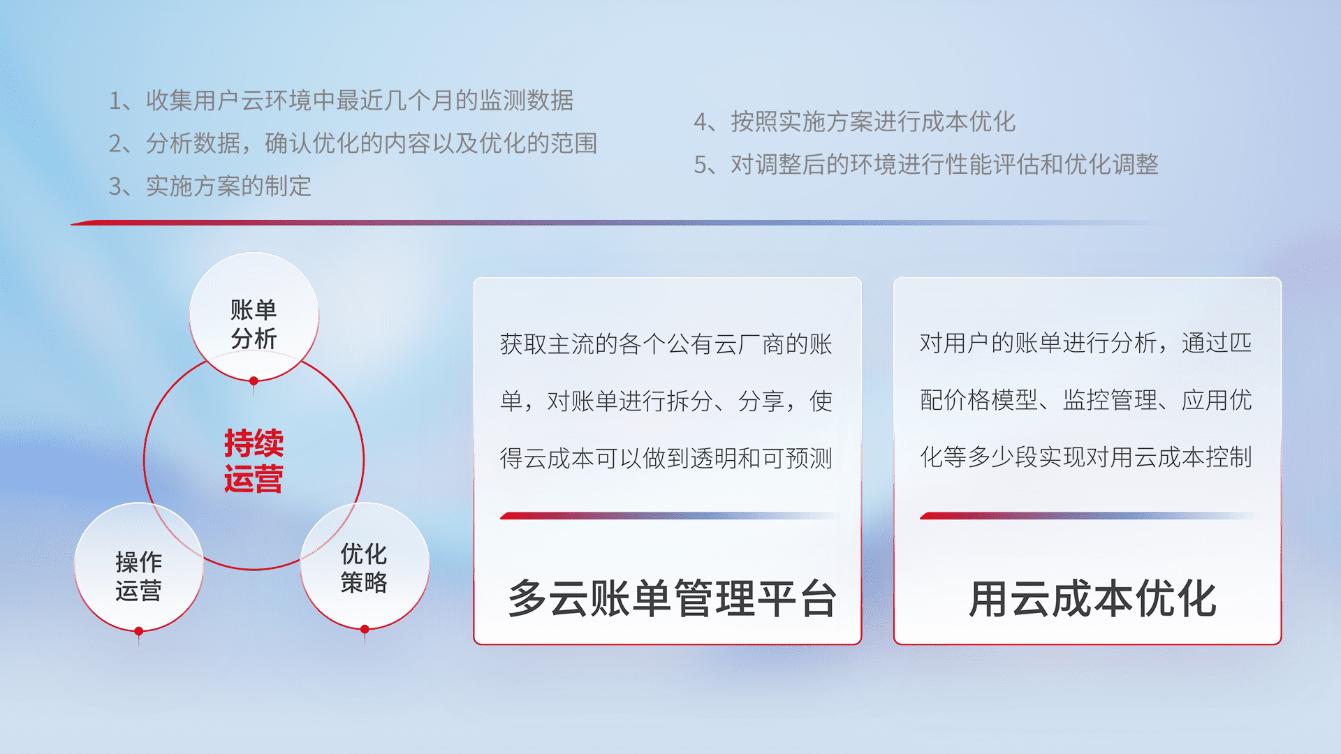 通过多云纳管,,以统一的资源数据模型把客户的云资源进行抽象和封装,,,进而实现对多云资源的统一操作,,,,保障云资源管理的可靠性、、稳定性与可用性。。量身定制化运维内容,,,配置、、、开发运维、、补丁管理、、、、备份、、、监控、、认证和访问管理、、审计和日常巡检等,,,,保障在用云过程中的可靠度,,稳定度以及高可用率。。。。
